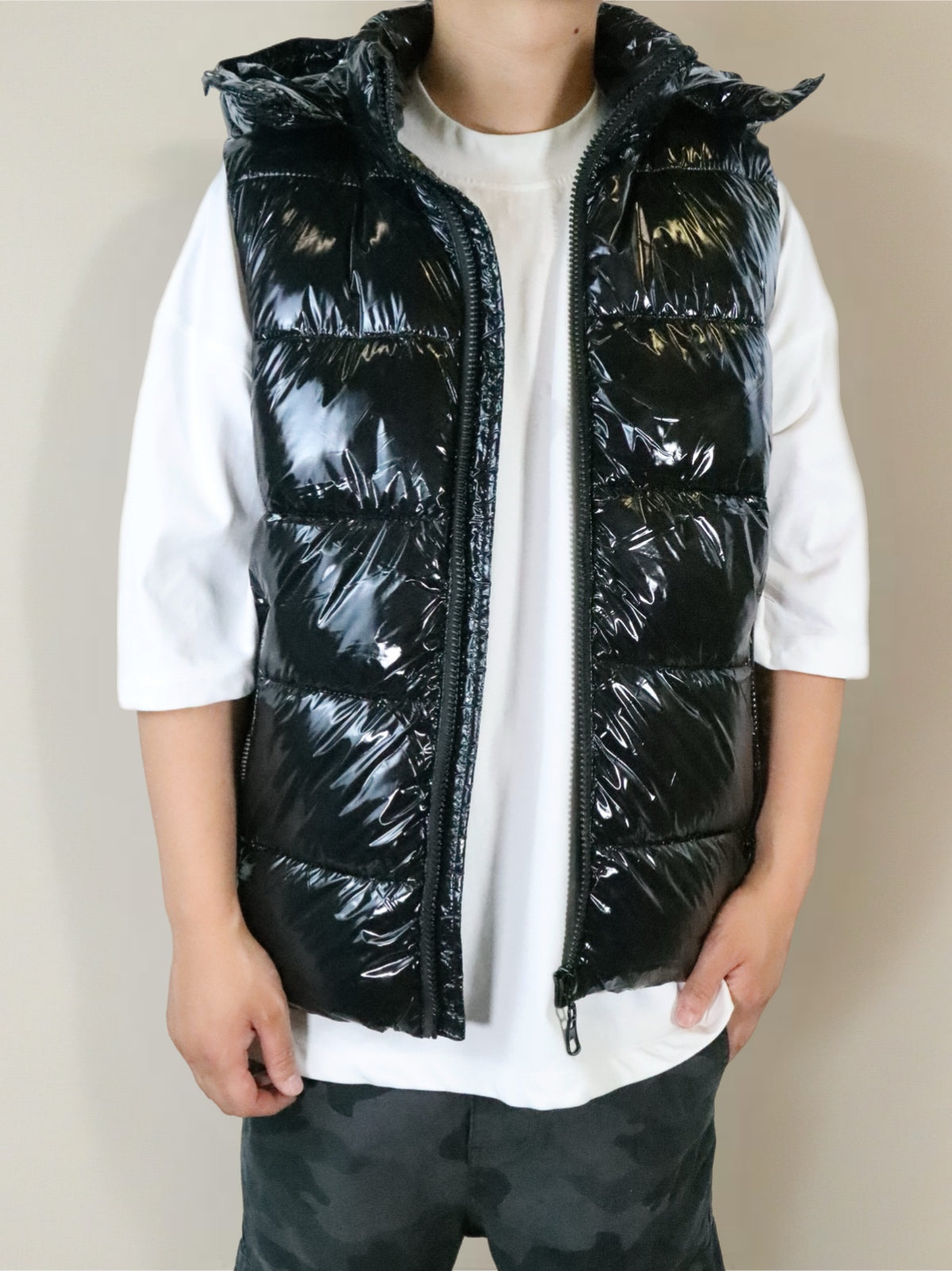 Smanicato lucido cappuccio nero uomo